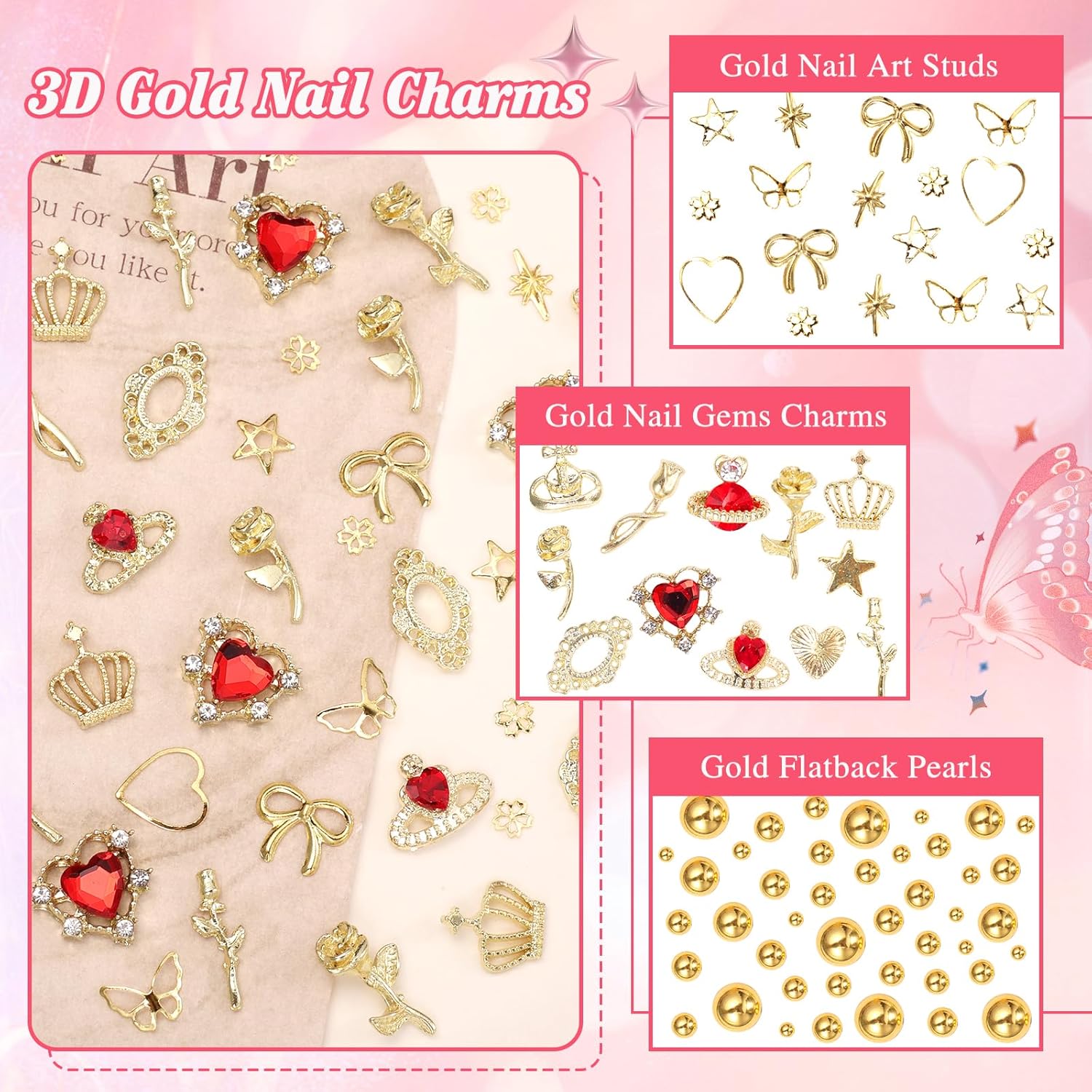 - You Will Get: You will receive 2 boxes gold nail art charms, including golden star heart nail charms, flatback gold pearls charms for nail and blossom flowers nail rivet charms. Enough quanity can meet all your creative needs in diy nail art or other craft projects, making your nails charming
