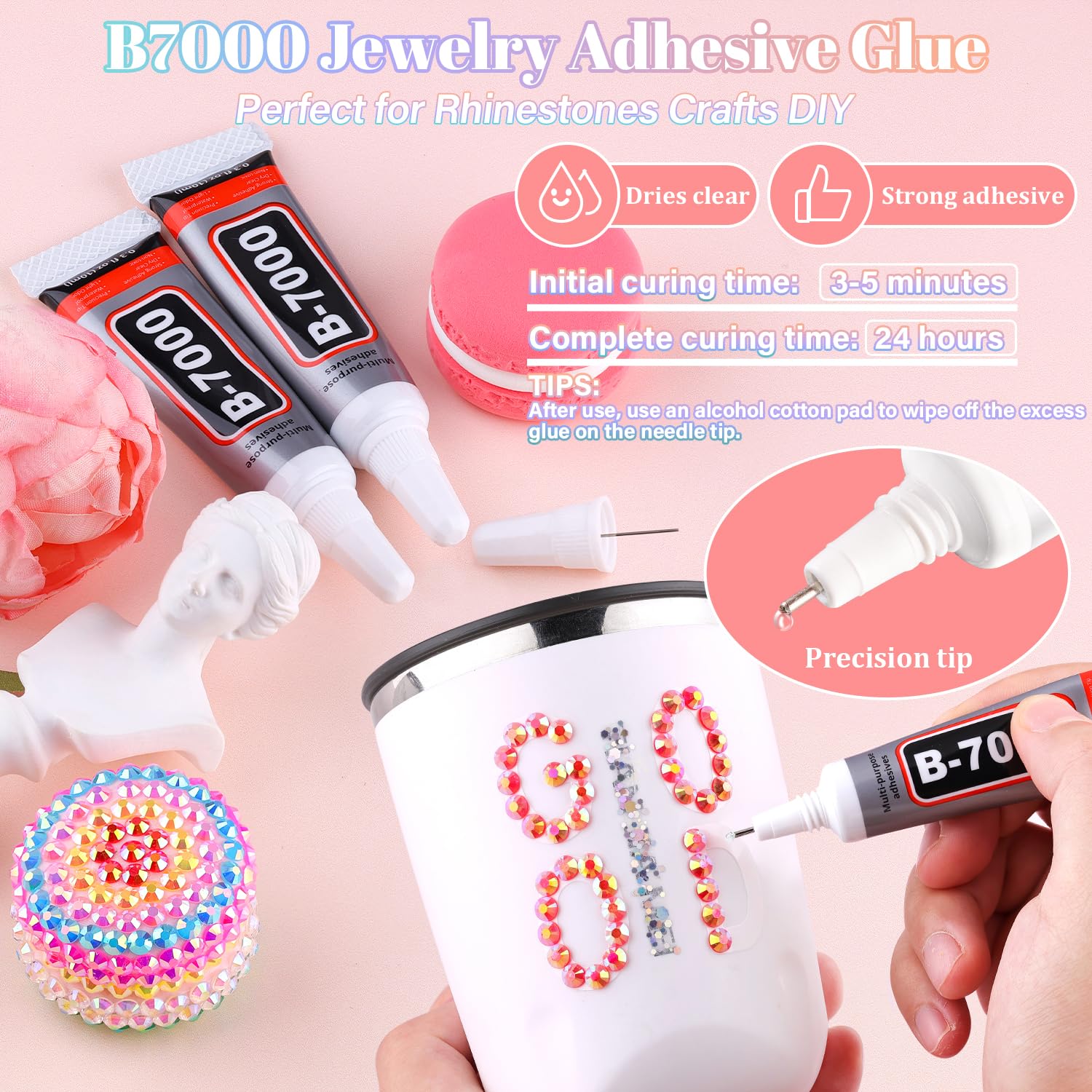 • B7000 CLEAR GLUE FOR GEMS -- Strong adhesion and dries clear, precision needle for easy application. The initial cure time is 3-5 minutes and the full cure time is 24 hours. After use, the needle should to be wiped with an alcohol pad