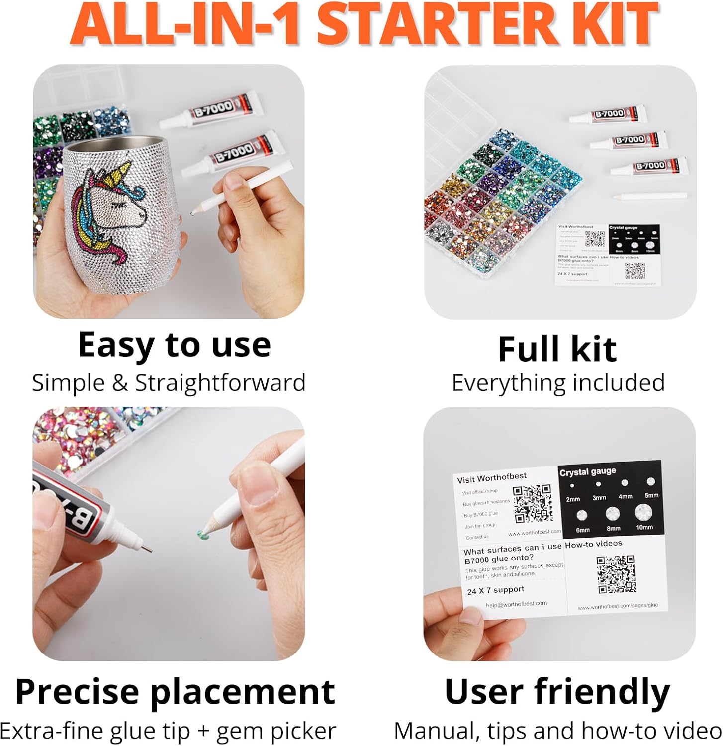 - Easy to Use -- This kit is designed to be straightforward, and versatile for various crafting projects. The manual is user-friendly and beneficial for both novice and experienced crafters. The complete and durable tools are suitable for precisely applying rhinestones to create intricate designs, with no additional tools required. Rhinestones are easy to apply and remove. The sturdy container with 24 grids keeps all rhinestones organized by size and color, making them easy to store and access