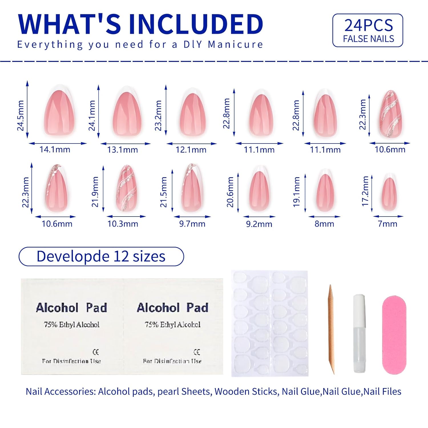 • Package Includes: 24 pcs stick on false glue on nails kit, each box includes 24 short press on nails, 1 sheet of 24 sticky nail pieces, 1 cuticle stick, 1 double sided nail file and gel press on nails cleaning pads, a small tube of nail glue,All the tools you need to apply the nails are included in one set