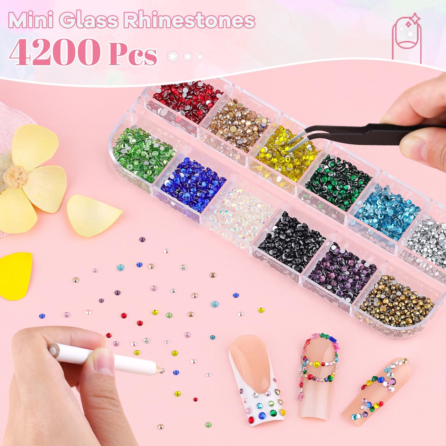 • Package Content -- One package includes approx. 4200 pcs (1.2/1.5/2/2.3 mm) Multicolors mini nail gems, 1 tweezers, 1 pick-up pencil and 15 ml rhinestone glue gel. The nail kit with sufficient tools can easily meet your nail design needs at home