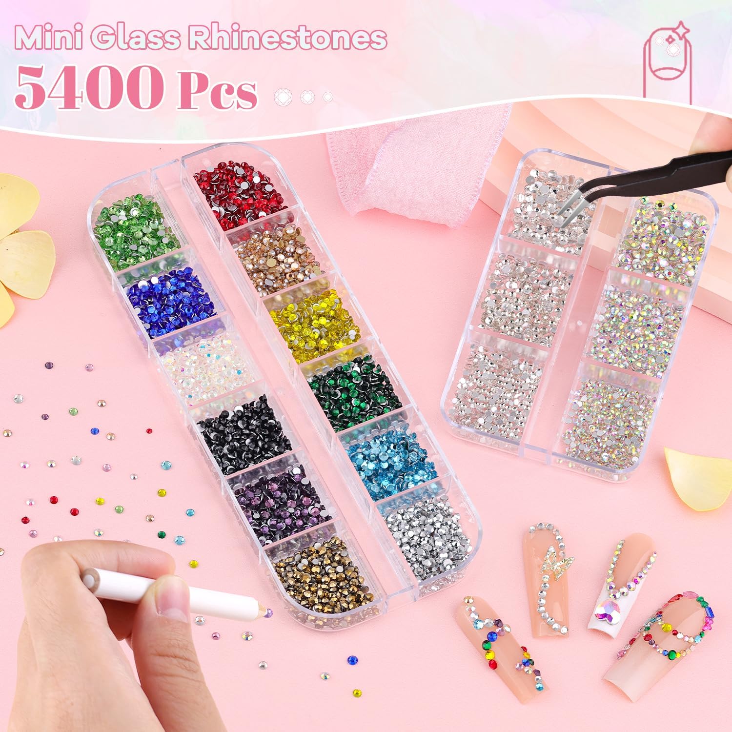 - Package Content -- One package includes approx. 4200 pcs (1.2/1.5/2/2.3 mm) Multicolors mini nail gems and approx. 1200 pcs (1.5/2/3 mm) clear AB nail rhinestones, 1 tweezers, 1 pick-up pencil. The nail kit with sufficient tools can easily meet your nail design needs at home