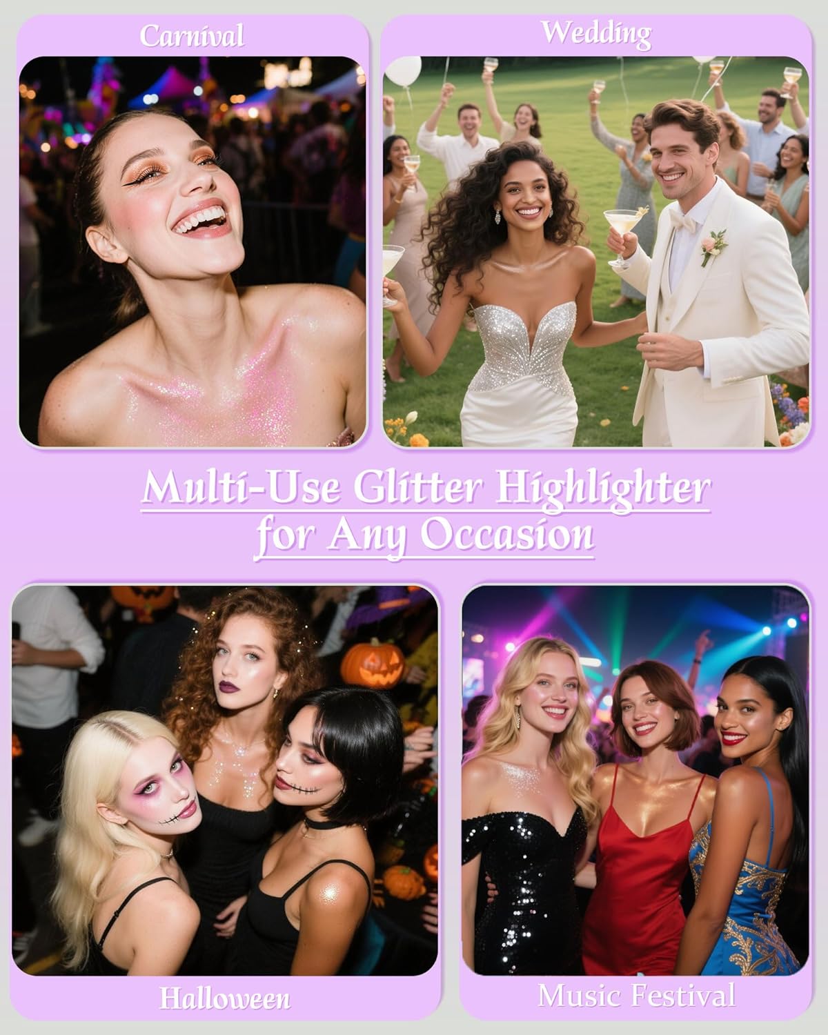 - Multi-Use Glitter Highlighter for Any Occasion:Glitter highlighters redefine versatility: use as face glitter, eyeshadow topper, or body glitter powder for festivals, weddings, or Halloween makeup. Compact size fits in clutch bags for travel-friendly touch-ups