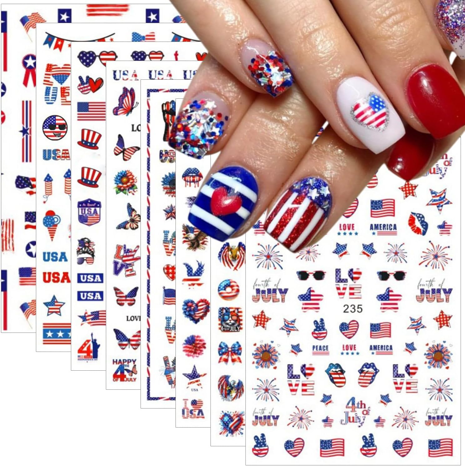 • Independence Day Nails Sticker Kit: You will get 8 sheets 3d patriotic nail art stickers decals, American flag nail designs decoration, a unique art design, attractive and creative, can add a strong holiday atmosphere.Perfect for women girls, DIY holiday nail design