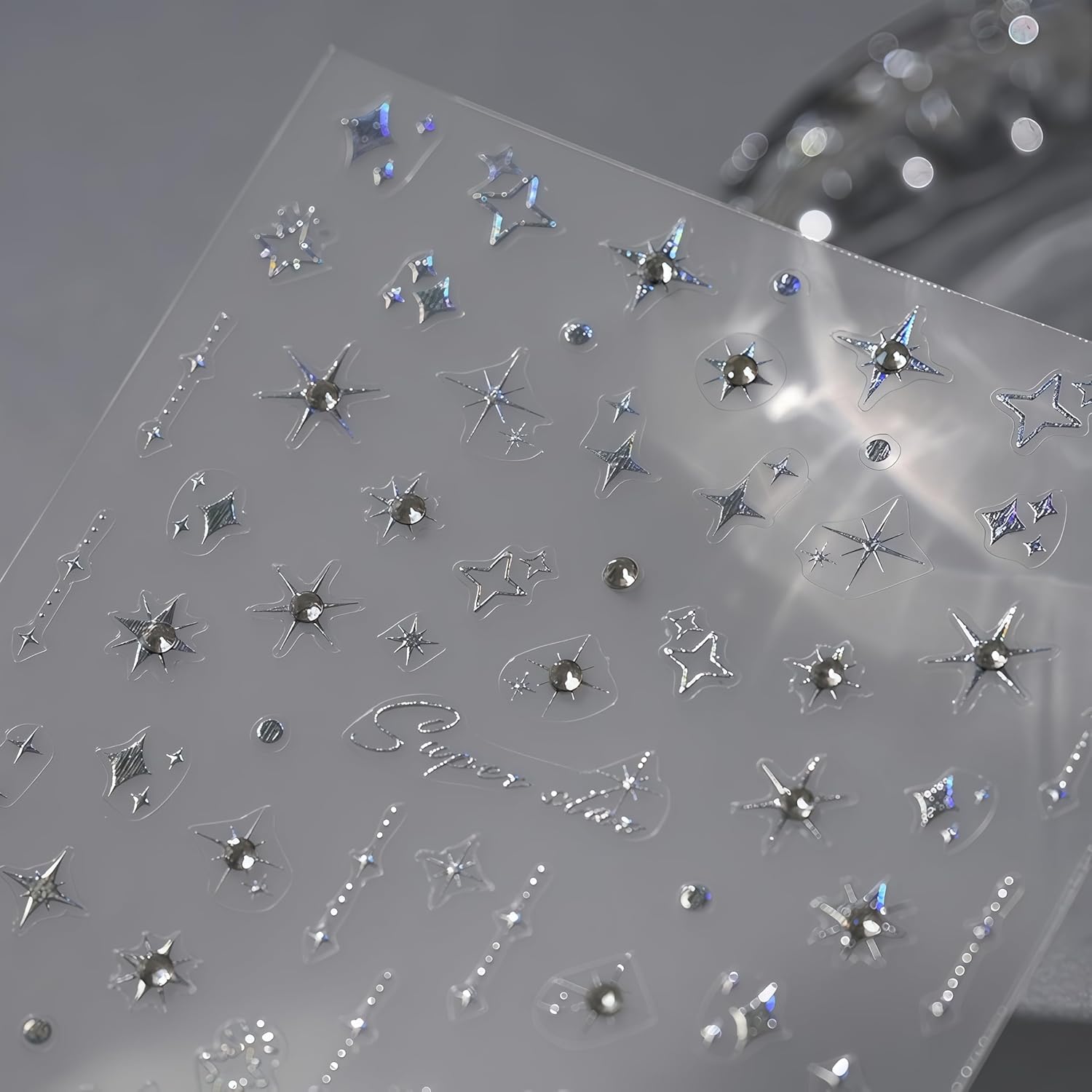 Glitter Diamond Stars Nail Art Stickers 3D Self-Adhesive Crystal Silver Decals Luxury with Rhinestones Stars Charms Design Stickers for Women DIY Manicure Decorations