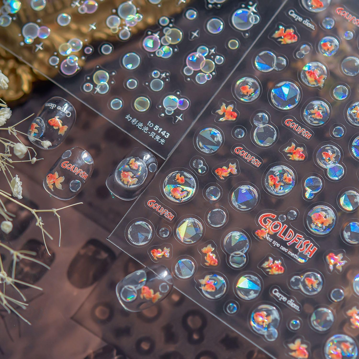 - Easy to Use: 5D embossed flowers/butterfly/goldfish/star nail art stickers are easy for you to apply; You can apply nail polish first, and then stick the nail sticker to your nails, last seal them with clean nail polish; Please note that the nail polish is not included in the package.