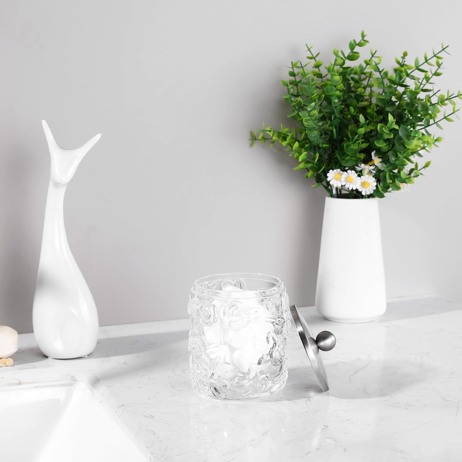 Home Glass Cotton Jar Holder Nickel Lid, Elegant Bathroom Storage Canister for Qtips, Cotton Balls, Floss, Makeup Organizer, Vanity Bathroom Organization (UPDATED NICKEL)