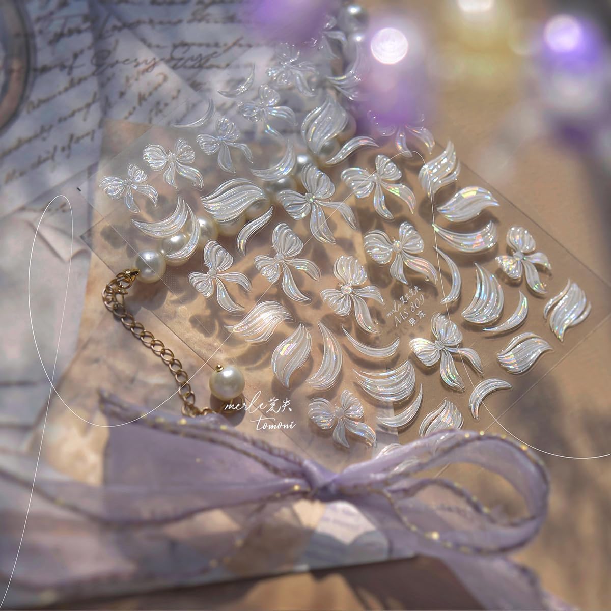 Bow Nail Art Stickers Decals Jelly Nail Art Stickers Silk Nails Art Decals with Design 5D Embossed Self Adhesive White Nails Sticker for Women Girls Kid Manicure Supply DIY Charms Decoration