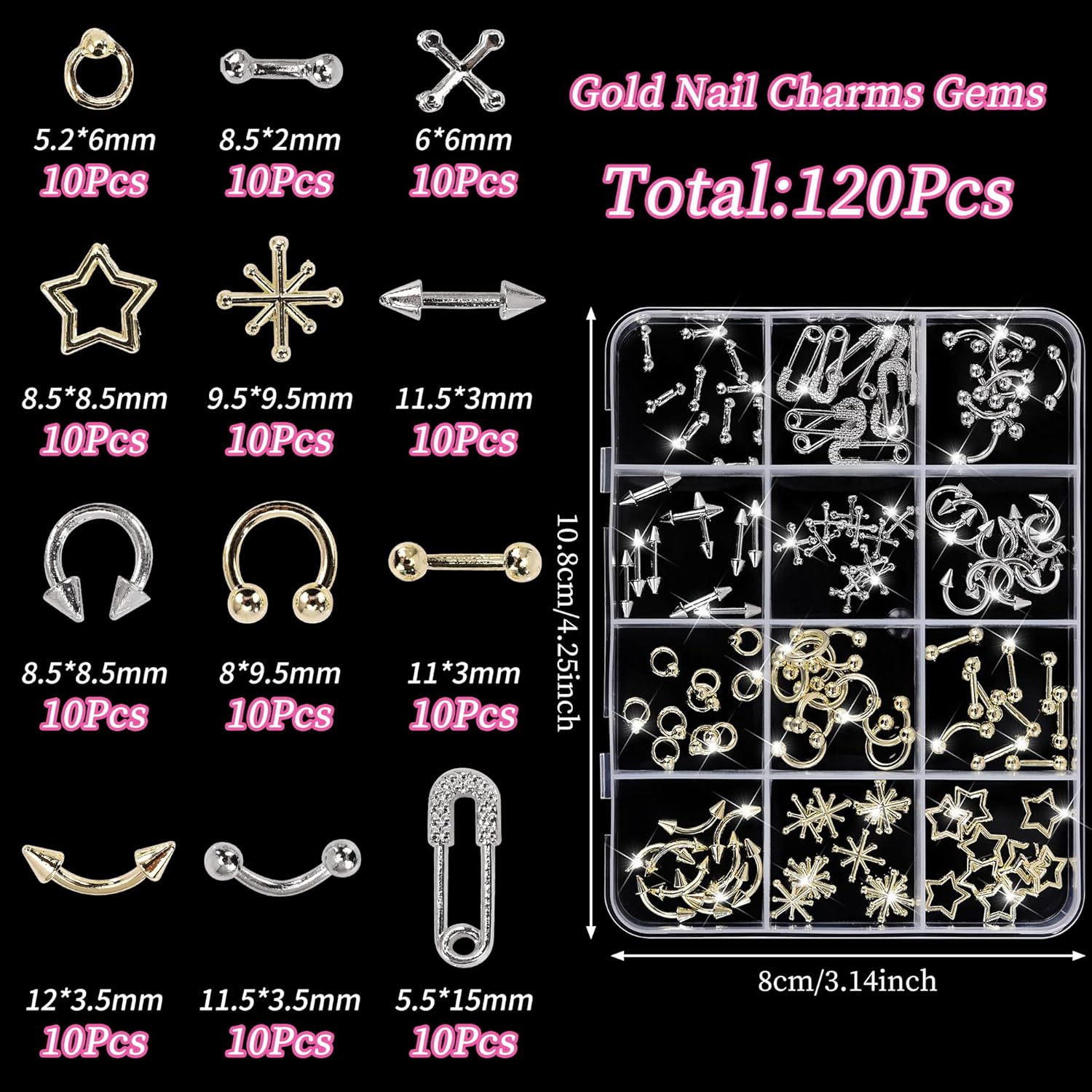 120 Silver Star Nail Charms - Gold Rivets Cross Nail Charms - 3D Crystal Nail Art, Y2k Retro Nail Rrt Cross Charm for DIY Designs Supplies B