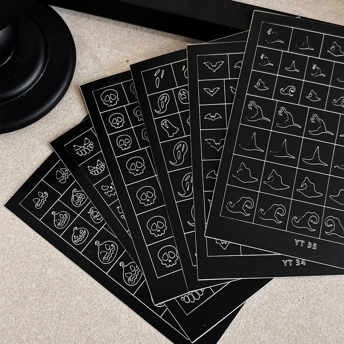 - Special Nail Designs:6 sheets airbrush stencils 3D self-adhesive stickers, the nail decals contain skull ghost witch bat pumpkin grimace designs, the best choice for halloween manicure,let you get a different manicure every day, it provides you with a variety of options to give full play to your rich imagination of nail DIY.