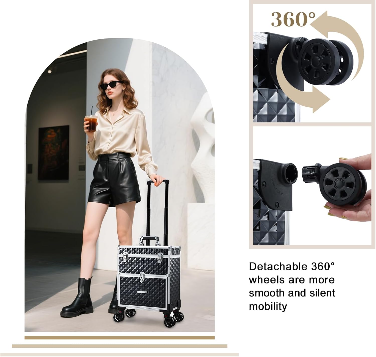 - Multi-Functional Rolling Case - The wheeled rolling makeup case with drawer is designed to meet the needs of professionals such as nail technicians, makeup artists, and hairstylist. It is also coated with pretty diamond stlye finish.