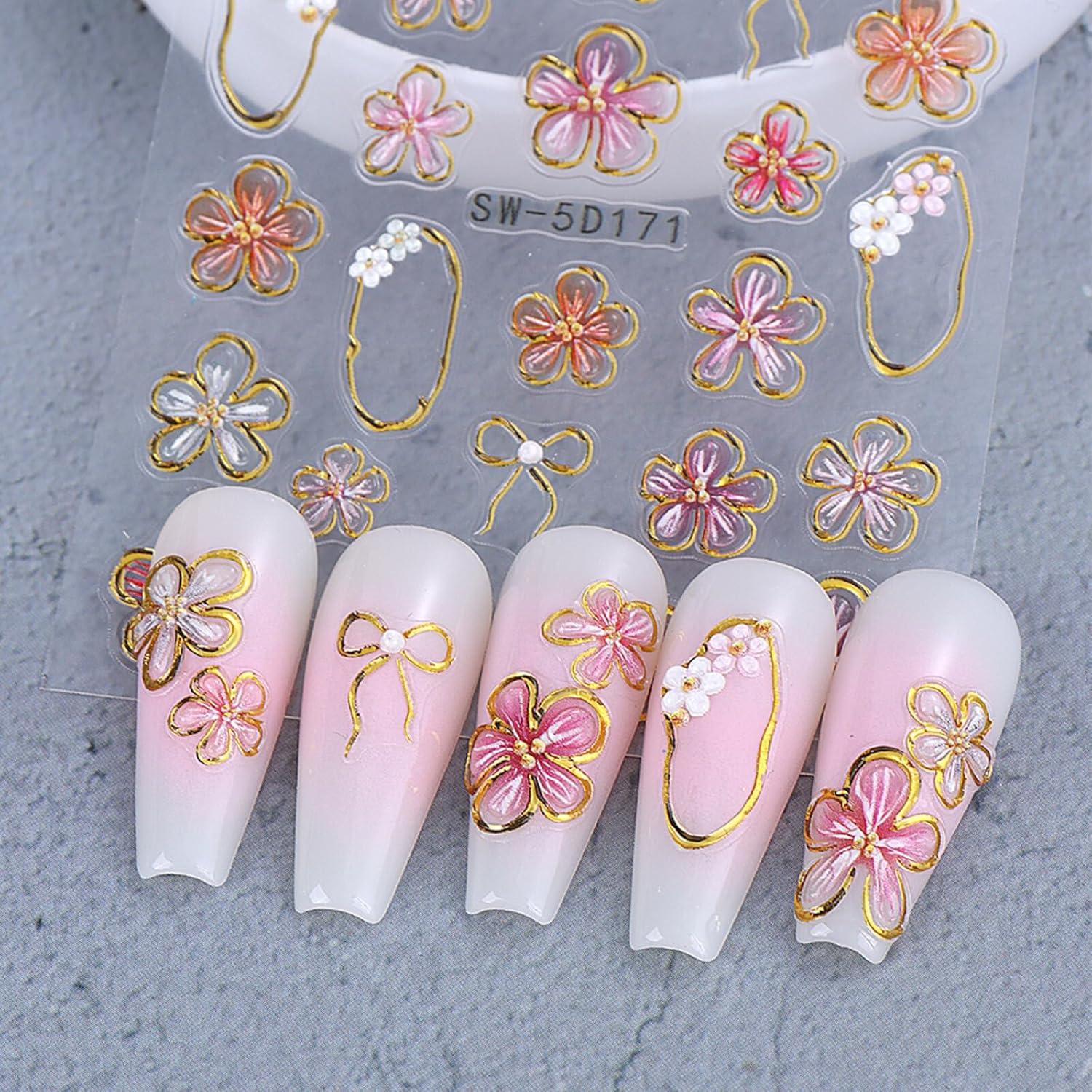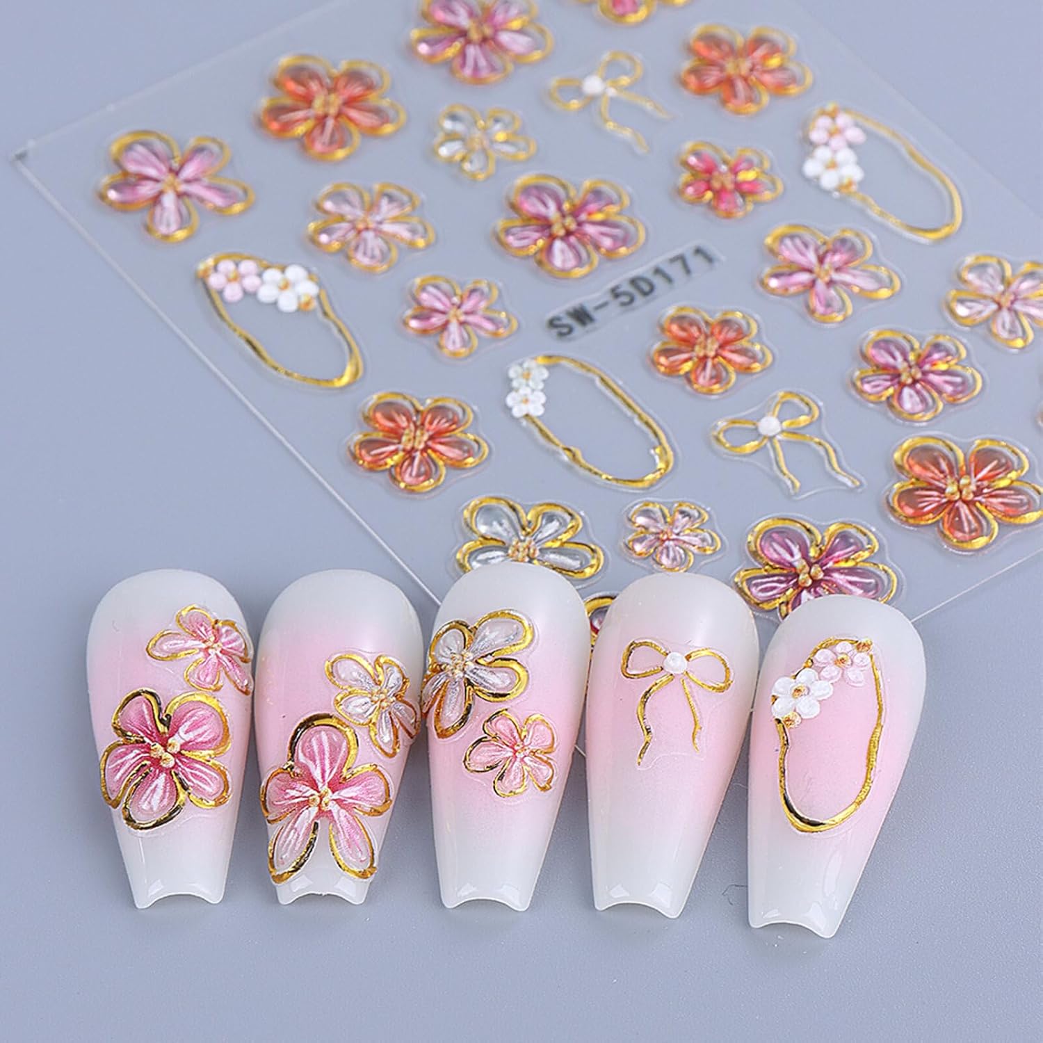 Flower Nail Stickers Decals 5D Embossed Flower Nail Decals Pink Five-Petaled Gold Floral Circle Spring Summer Nail Art Design Bow Tie Flowers Nail Adhesive Decals for DIY Nail Art Decorations 2Pcs