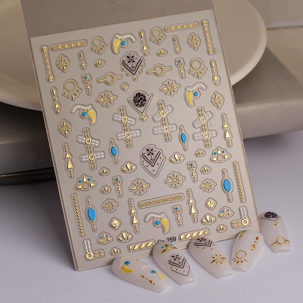 Gold Fall Nail Art Stickers 5D Embossed Geometric Bohemian Nail Stickers, Self-Adhesive Durable Nail Art Decals for Women Girls, Nail Wraps Decoration Manicure for DIY Acrylic Nail Accessories