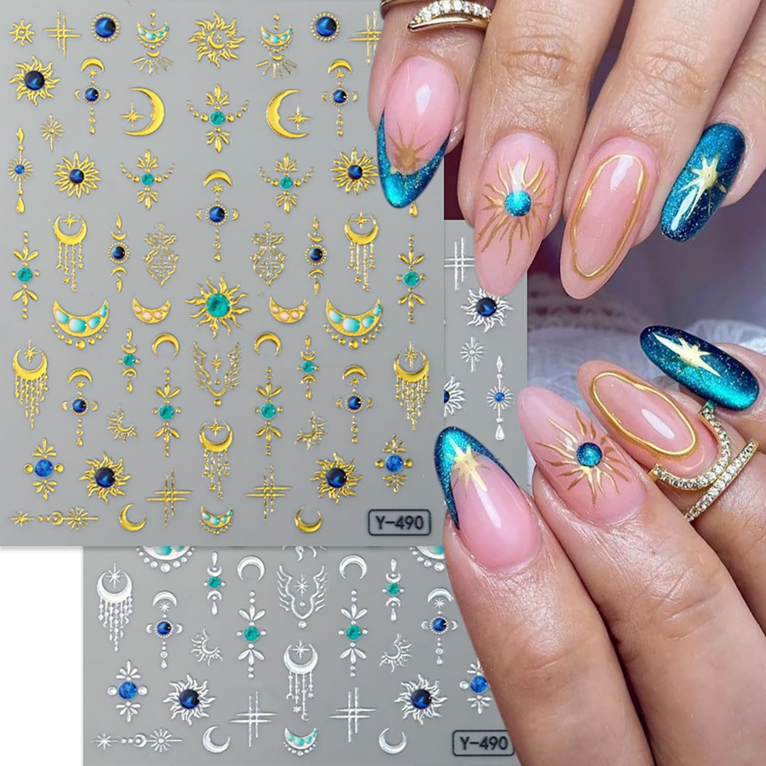 - Quantity:You will get 6 sheets 3D self -adhesive stars moon nail stickers, Each stickes size about 3.74x 3.14 inches(9.5x8cm). Green cat eye sun, gold stars, golden pendant moon, silver pendant moon, silver stars etc patterns design for your choice, these nail stickers are perfect for matching other nail art