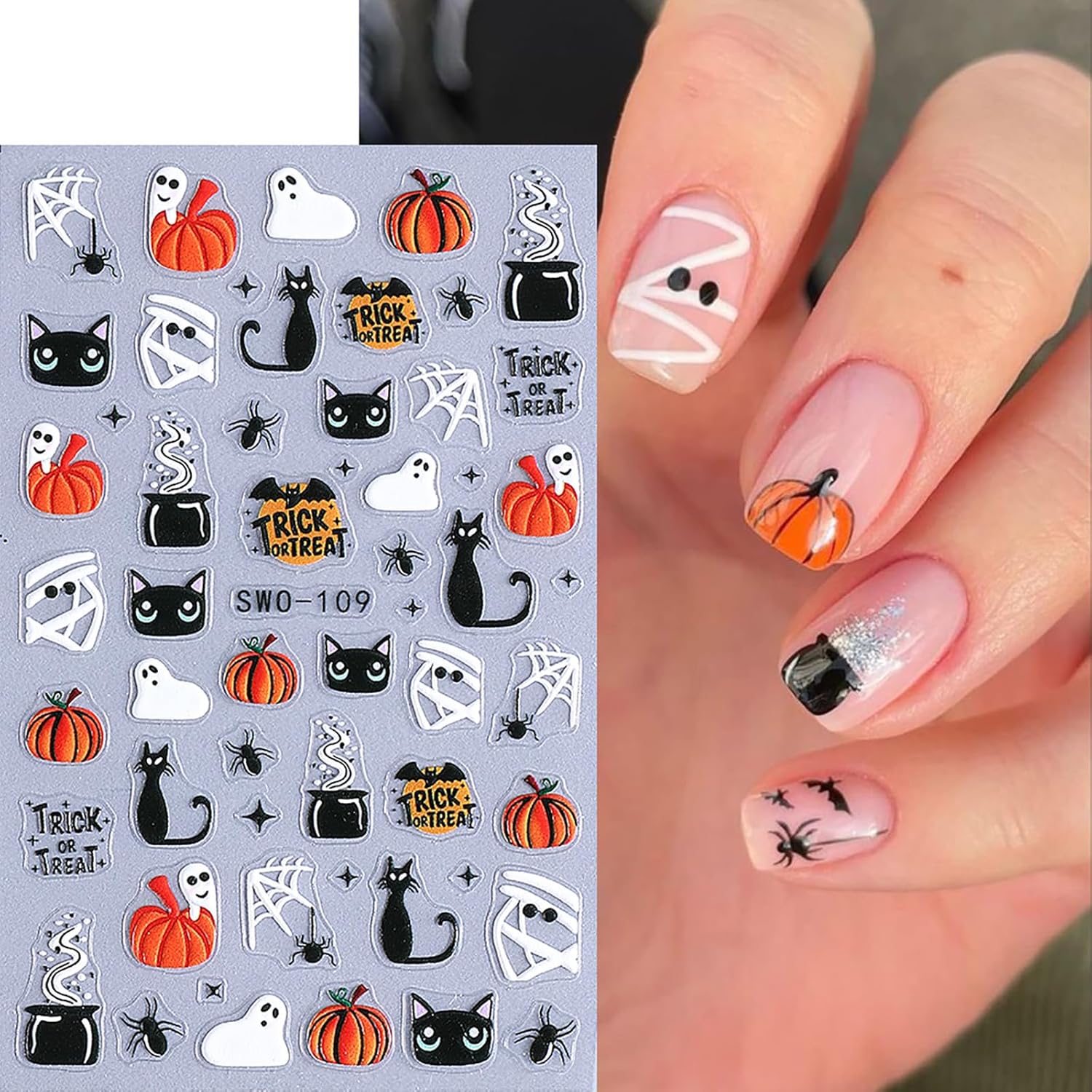 Halloween Nail Stickers 5D Spooky Nail Decals 4PCS Self-Adhesive Black Cat Pumpkins Spider Web Ghost Skeleton Hand Skull Design Gothic Halloween Nail Art Supplies for Women Holiday Nail Decorations