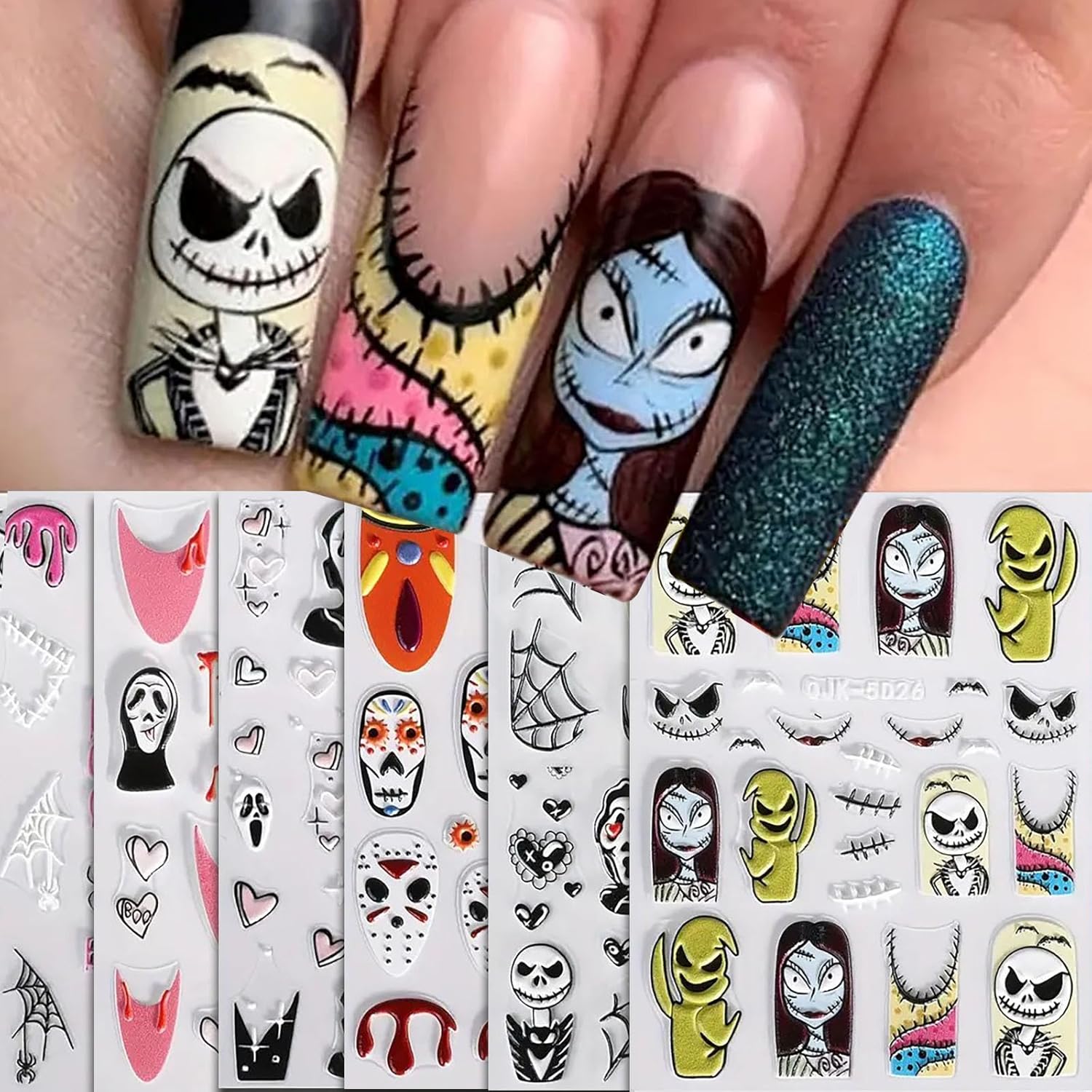 6 Sheets Halloween Nail Art Stickers Decals Pink Skull Spider Web Sugar Skull Nail Decoration 3D Self-Adhesive Nightmare Christmas Stickers for Women Girls